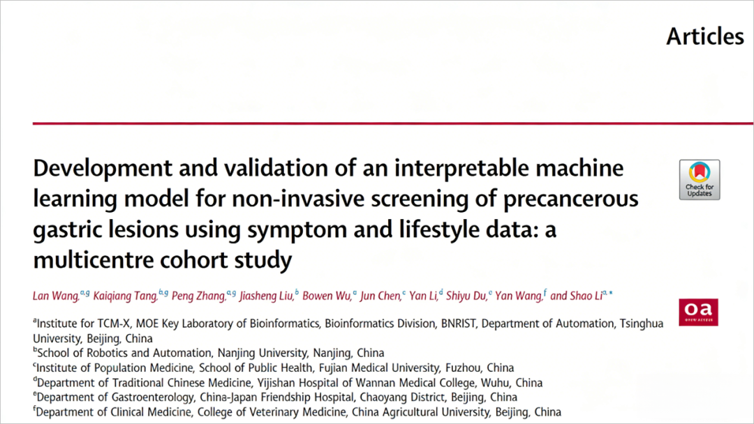 清华大学北京市中医药交叉研究所所长、欧洲科学与艺术院院士李梢课题组长期致力于从中西医“表型-组织-细胞-分子-药物”多层次网络的角度开展胃炎癌转化机理及防治研究,率先建立了胃癌极早期中西医智能与精准防治体系。2026年1月,李梢课题组在《柳叶刀》子刊eClinicalMedicine(中科院1区,TOP期刊)上发表了题为“Development and validation of an interpretable machine learning model for non-invasive screening of precancerous gastric lesions using symptom and lifestyle data: a multicentre cohort study”(“基于症状和生活方式数据的可解释机器学习模型在胃癌前病变无创筛查中的开发与验证:一项多中心队列研究”)的研究论文,创建了首个融合患者中西医临床症状信息与生活方式数据的可解释智能筛查模型,实现胃癌前病变的高精度、非侵入筛查。经多中心临床队列及自然人群队列验证,相比指南推荐的筛查策略,该模型显著提升了胃癌前病变的筛查精度,并大幅降低了筛查成本,为提升胃癌前病变内镜筛查的针对性与覆盖度、推动胃炎癌转化中西医智能与精准预警提供了新工具、新方案。