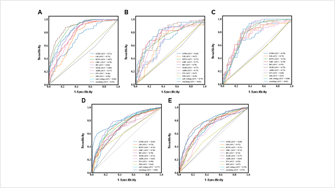 图3. 机器学习模型在五个数据集上对胃癌前病变风险预测的诊断性能