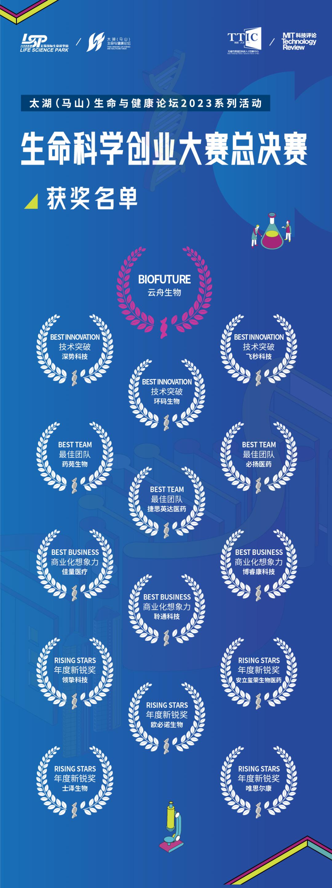2023 年 3 月 4 日,《麻省理工科技评论》中国·第二届生命科学创业大赛总决赛在无锡滨湖区拈花湾波罗蜜多会议中心成功举办,现场在入围的 30 家初创企业中诞生了包括年度新锐奖、技术突破奖、最佳团队奖、商业化想象力奖和 Bio Future 大奖在内的大赛奖项。中国科学院院士、美国艺术与科学院院士、清华大学教授饶子和,中国科学院院士、南方科技大学代理副校长、讲席教授顾东风,与上海交通大学特聘教授许平应邀出席,无锡滨湖区委书记孙海东及各级领导亲临大赛现场。